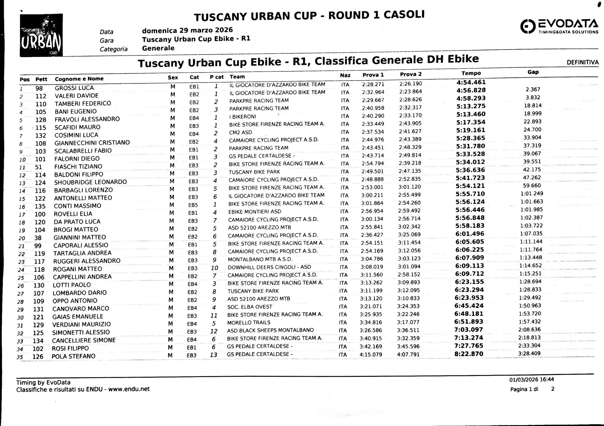 Buono l’esordio della Squadra Downhill G.S. Certaldese con un terzo posto nella categoria EB1 e 10° in classifica generale di Diego Falorni (su Brinke XXR Carbon) che, a causa di una scivolata, ha dovuto cedere purtroppo molti secondi di vantaggio che lo hanno penalizzato in classifica finale. Sono incappati in una cadura anche Pola e Rosi,  anche loro lasciato preziosi secondi sulla classifica finale. Tutte le cadute, fortunatamente, sono state senza conseguenze di rilievo.